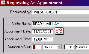 Appointment Book - Pre-authorized visitors are recorded in the appointment book. The record includes, persons whom requested and authorized visit, visitor's name, phone number, company represented, company address, telephone number and visitors classification.